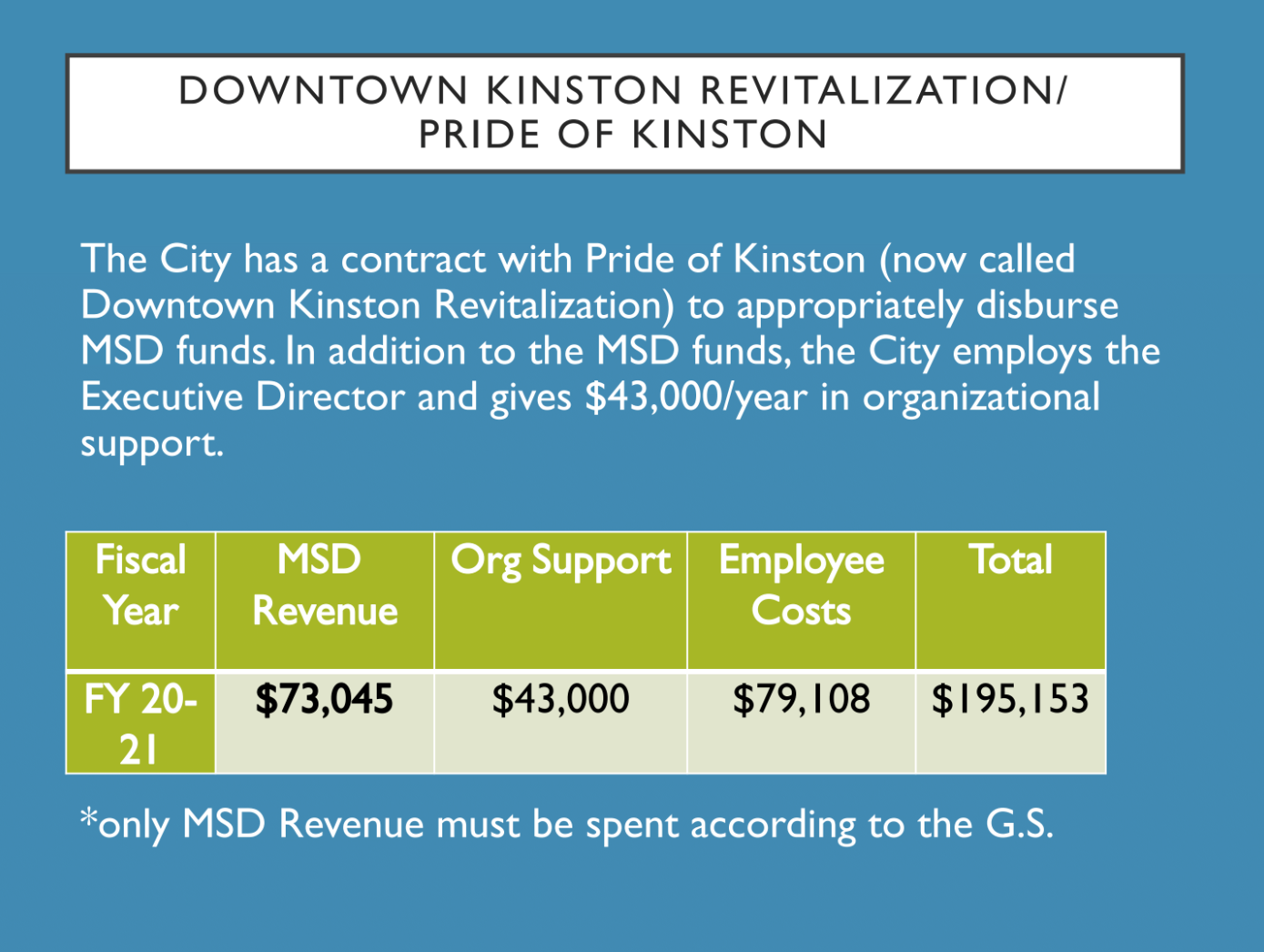 The City of Kinston currently allocates all MSD revenues to Downtown Kinston Revitalization to provide MSD services on behalf of the City. As of 2021, the MSD tax currently generates approximately $73,000 of funding a year.