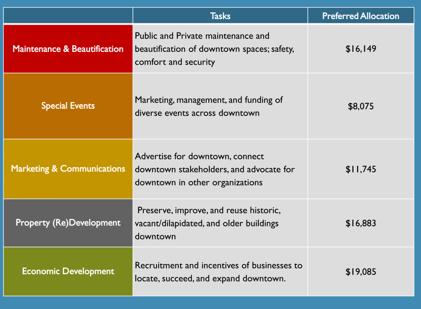 The survey asked for stakeholder satisfaction in 5 categories: Economic Development, Maintenance & Beautification, Special Events, Marketing & Communications, and Property (Re)development